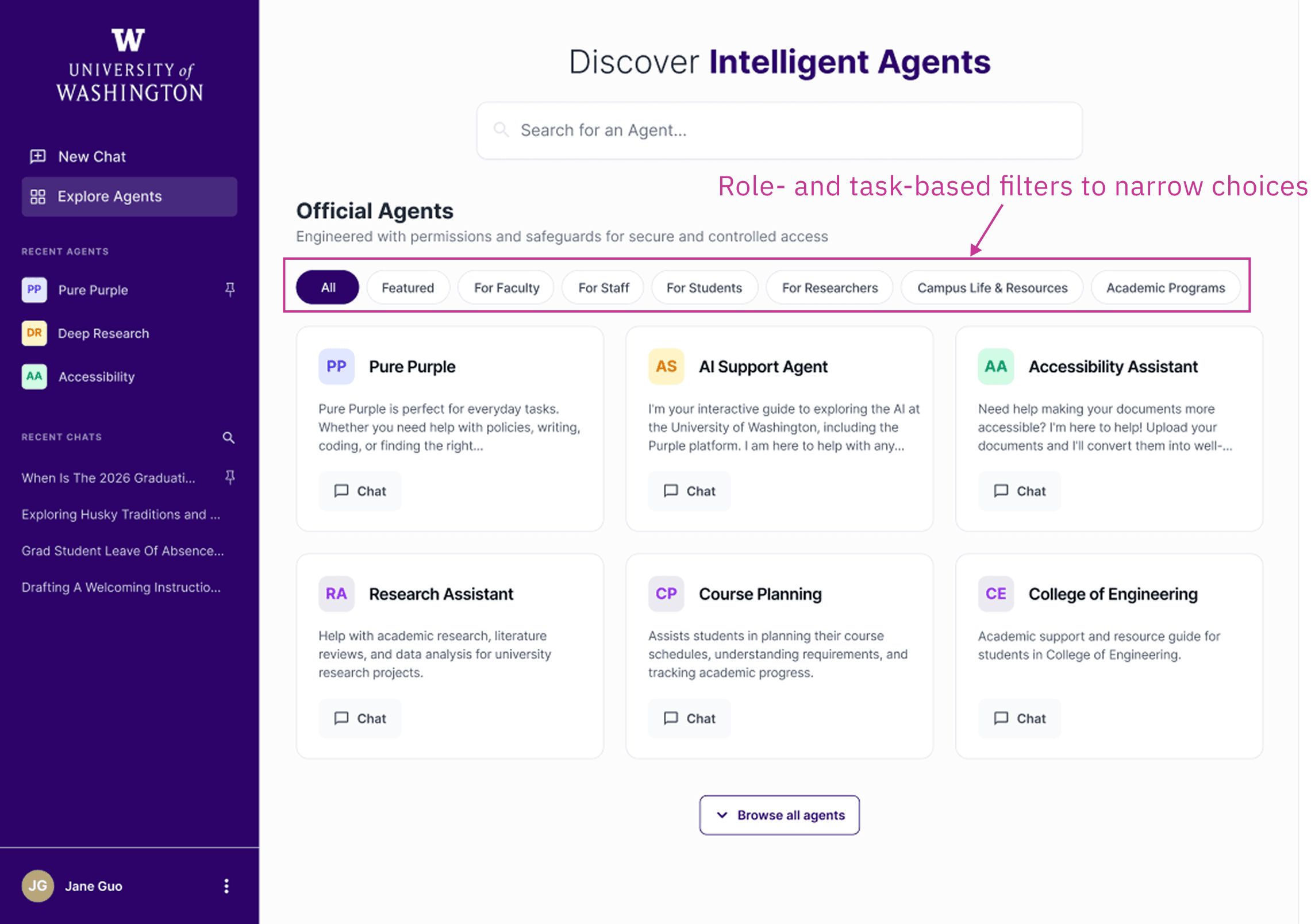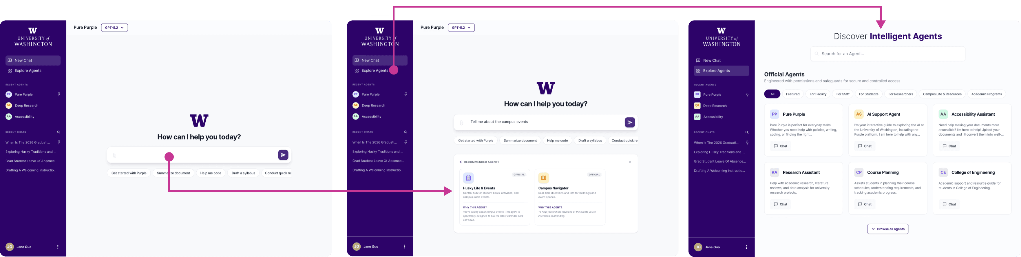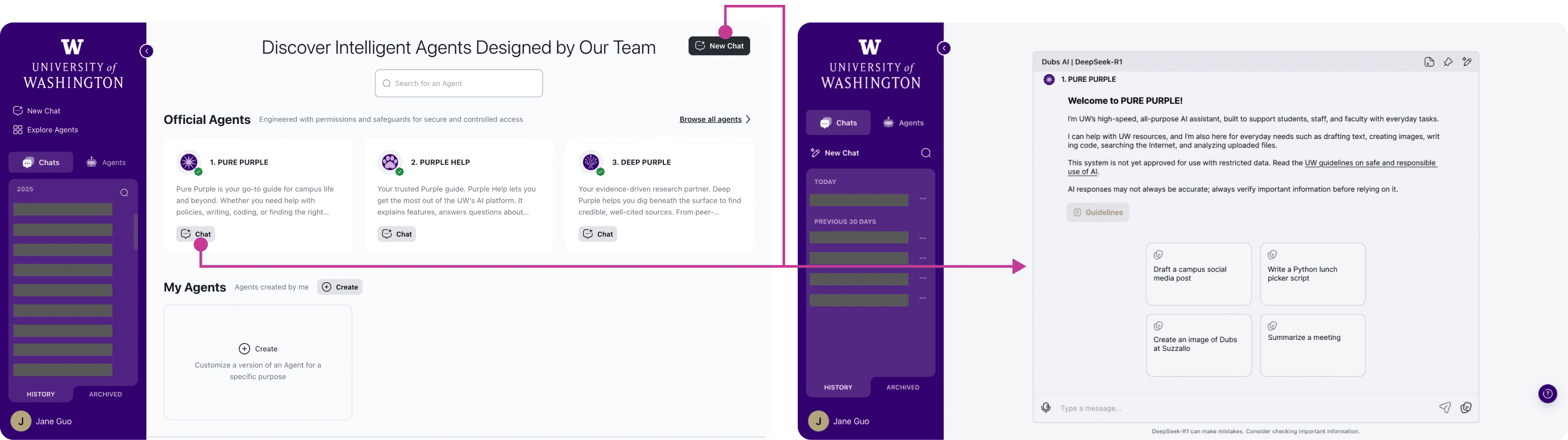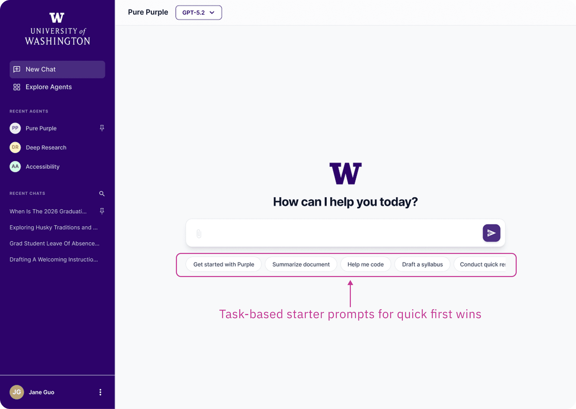 For many UW staff and faculty, AI had been off-limits at the university until now. So when Purple launched, users would land on a screen full of specialized "agents" with no clear signal of which one to pick, what to type, or whether it was even safe to share their work there.